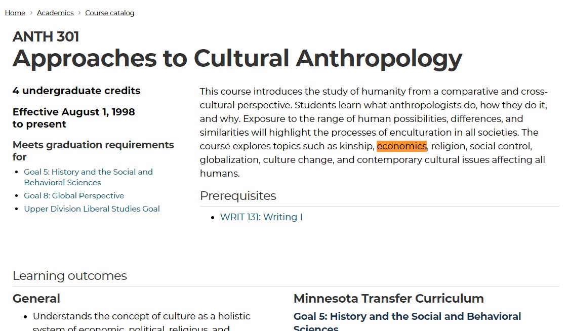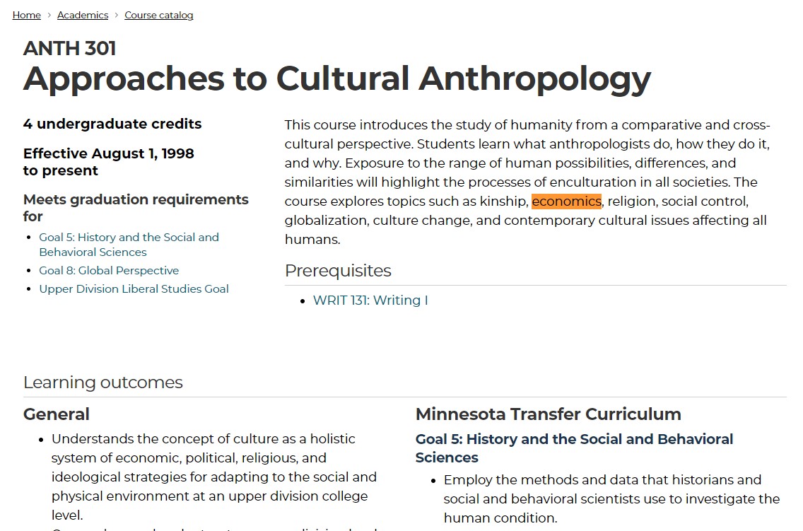 I counted the term "economics" 1 time on ANTH 301's webpage. I counted the term "economics" 10 times on ECON 200's webpage.