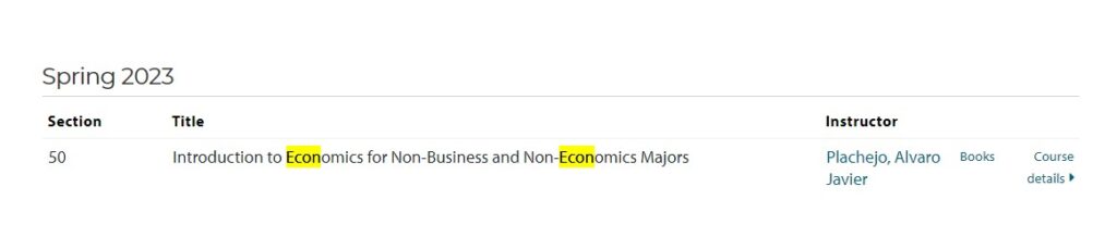 I typed the search term "economics" in my college's course directory, and it returned courses that included the term "economics" anywhere in their descriptions, in alphabetical order.