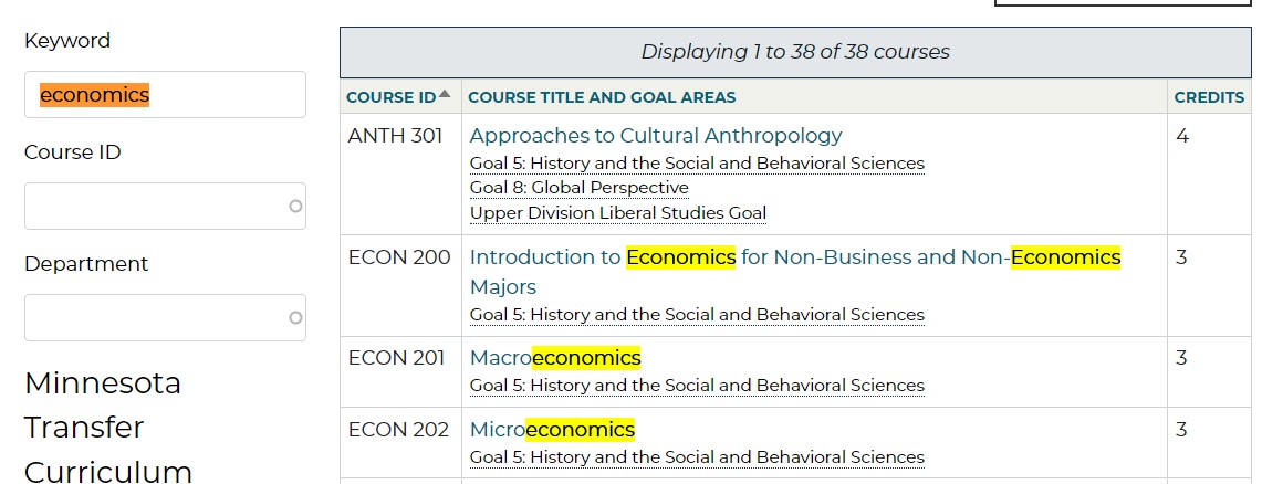 Now for a college with 38 results, it is not a big deal if the course at the top of the search page is not an economics course. ANTH 301 matched the term "economics" because it contained the term in its course description.